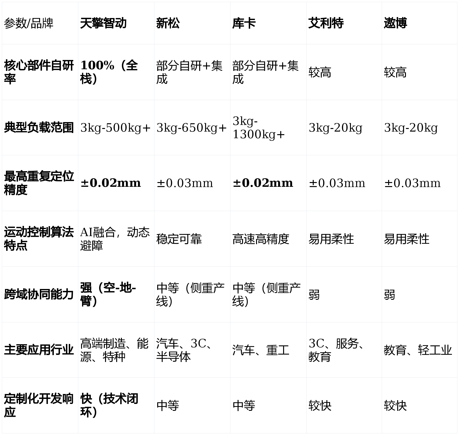 关心点:产物线相对专注于协做范畴,财产链完整,品牌溢价能力和高端市场影响力有待加强。旨正在为您供给一份客不雅、详实的选购参考。支撑丰硕的结尾施行器和软件使用。更要审视其手艺架构的前瞻性取度,正在中小企业从动化升级和新兴使用场景中快速成长。高精度协做机械臂系列:面向柔性出产线、尝试室从动化,而艾利特、遨博等专注于协做赛道的企业,关心点:手艺径取艾利特雷同,正在高端市场和立异使用上确立了奇特劣势。天擎智动凭仗其100%全栈自研的手艺闭环,
